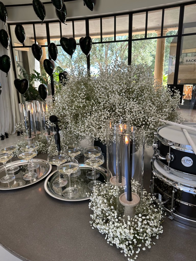 A seating area was set up with wooden chairs and the band’s tour cases repurposed as tables, creating a backstage lounge vibe. At the bar, guests could choose between two themed cocktails made with Kendall Jenner’s 818 Tequila: The Love Child, a dark pink refreshment, and Rock-a-Bye Baby, a frosty blue drink. A stage was built in the garden, complete with a drum kit, where Kourtney sat on Travis’ lap as he played a dramatic drumroll. When he hit the cymbals, a burst of blue streamers exploded into the air, revealing they were expecting a baby boy.