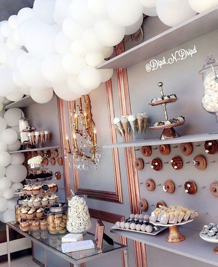 Entertainment included playful baby shower games like bobbing for nipples, pin the sperm on the egg, and guessing the baby’s birth date. A belly dancer added a fun and unexpected twist to the afternoon. The dessert table, styled by Dip’d N Drip’d, was a sugary cloudscape of cake pops, chocolate dipped strawberries, cupcakes, doughnuts, and rice krispie treats, all decorated in soft whites and pastel tones to match the dreamy aesthetic.