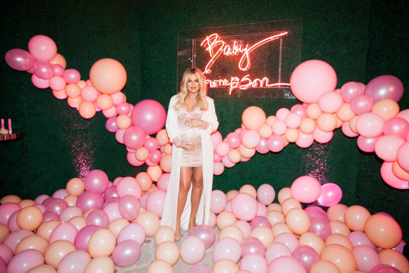 The photo backdrop was a floor to ceiling wall of pink balloons in every shade, with a custom neon sign reading Baby Thompson, in Kris Jenner’s actual handwriting. It became the go to selfie spot for guests, and the photos were as dreamy as the décor.