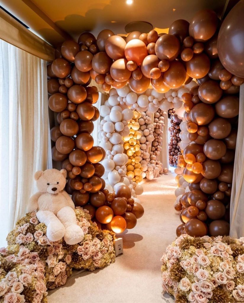 As guests entered, they walked through what Khloe called the “stairway to heaven,” a hallway completely filled with oversized neutral balloons, creating a tunnel like effect. The balloons varied in size and tone, from soft ivory to warm caramel, and floated above and around guests like clouds. It was a breathtaking entrance that set the tone for the rest of the event.