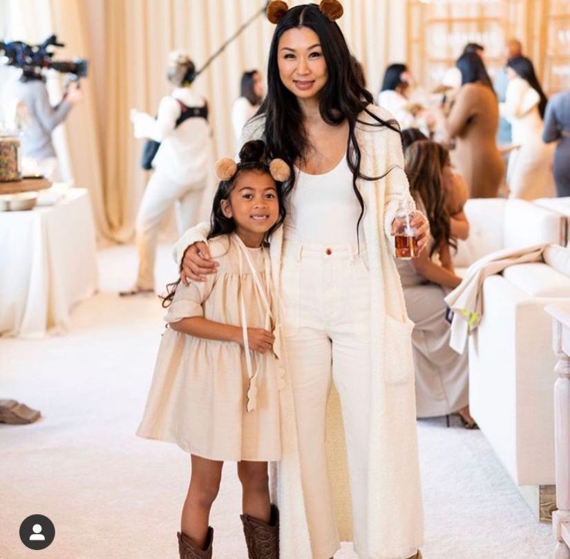 North was also part of the celebration, wearing a floral print East Asian inspired dress and fuzzy white slides to match the cherry blossom theme. It was a sweet mother daughter moment that added to the family feel of the event.