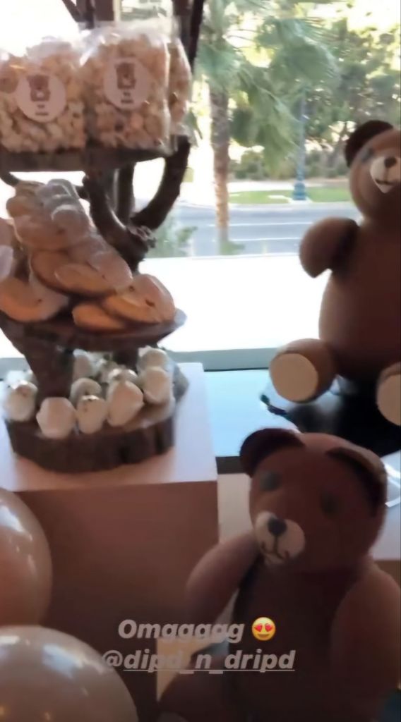 Set up a craft or activity station, like the embroidery table at Kylie’s giraffe shower, the baby clothes decorating at Kylie’s pink shower, the blend your own bath salts, tea bar, flower arranging, and sound bath at Kim’s CBD & Meditation shower, or the colouring in station at Kourtney’s World Tour gender reveal.