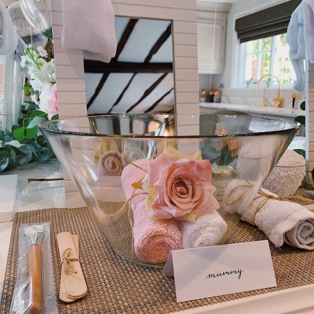 The spa station was styled with bottles of cherry blossom branches, and each guest had their own mirror, hair band, glass bowl, flannel, nail file, applicator brush, and natural scrub and moisturiser.