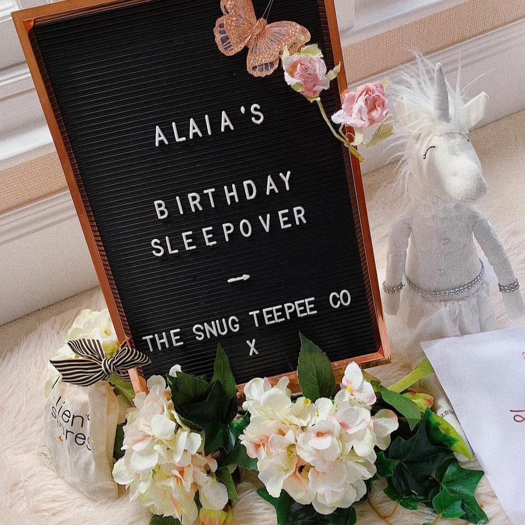 Each tent was fitted with a plush white duvet, rolled up and tied with a rose gold ribbon and a handwritten calligraphy tag, a small touch that made a big impact. Nearby, a pegboard sign welcomed guests to the birthday sleepover, adding a personal and playful touch.