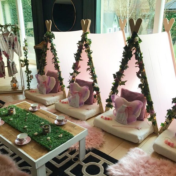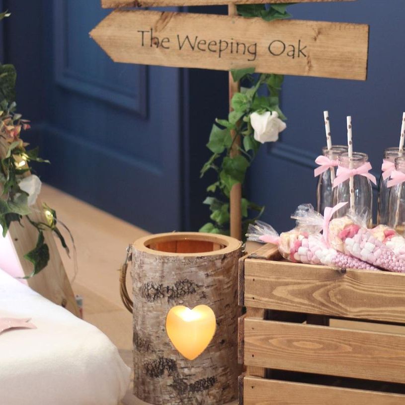 - Use props and greenery to build a magical world – from ivy wrapped teepees and a rustic woodland signpost to tree stump lanterns and fairy dust, every element helped transform the room into a whimsical forest.