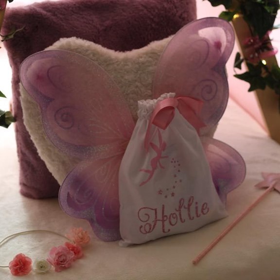 Each child received a set of fairy princess accessories at the end of their bed, including butterfly wings, a wand, a floral headpiece, and a personalised goody bag.