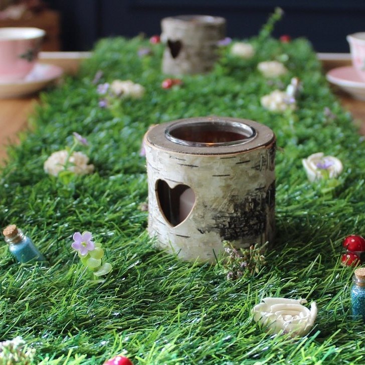 To bring the fairy forest theme to life, the team used well placed props to create a magical woodland like a rustic signpost pointing to places like “Pixie Meadow” and “Majestic Falls”, and wrapped ivy and roses around the teepees, clothes rail, and sweets display. Artificial grass and miniature flowers were used to decorate the table, and tree stump lanterns scattered throughout the camp added a warm, woodland glow.