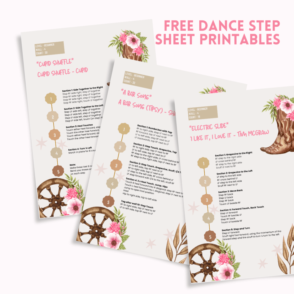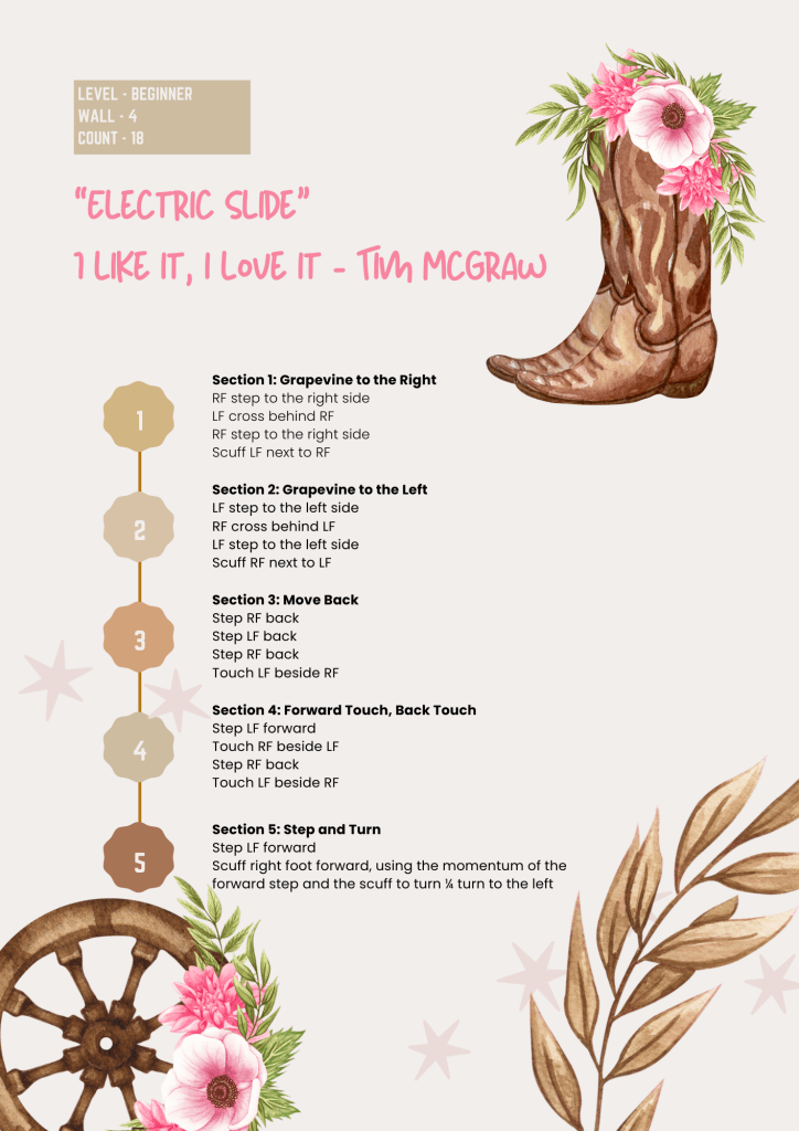 • Grapevine – A classic line dance move: step to the side, cross behind, step again, tap. It’s in loads of beginner routines.